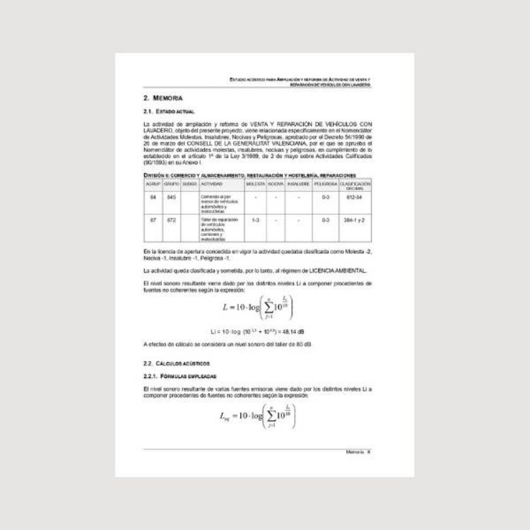 Contenido completo del estudio acústico de un taller mecánico con exposición y lavadero (20 págs. en .docx y 3 planos en .pdf)