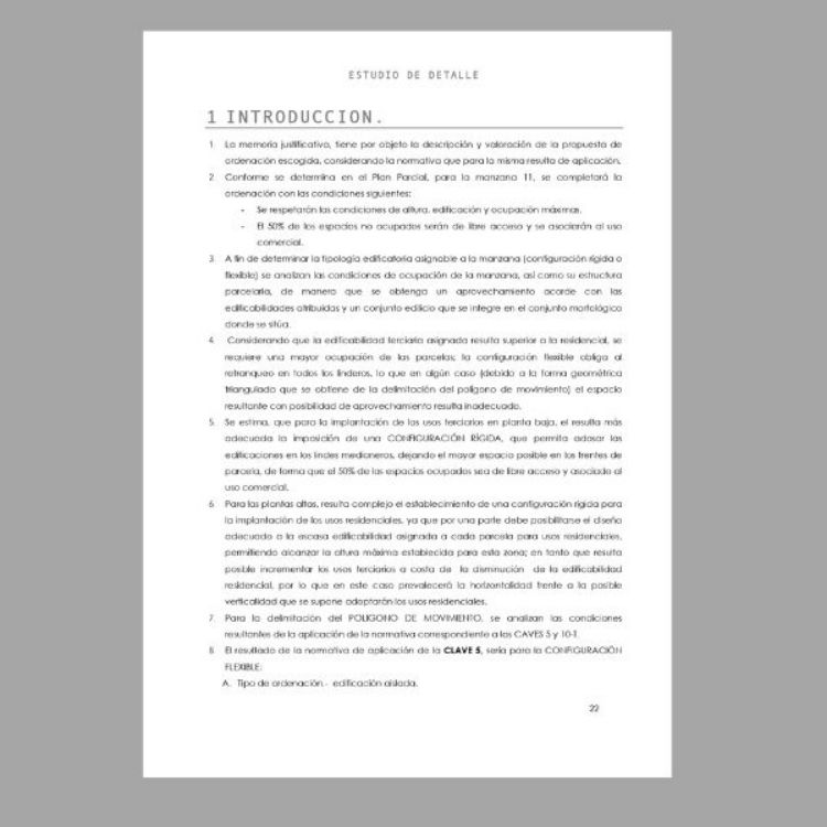 Estudio de detalle en un suelo urbano de un caso real y en versión editable en .DOCX y planos en .DWG donde se define la ordenación interior de los volúmenes edificables de acuerdo con las especificaciones del planeamiento y el señalamiento de alineaciones y rasantes. Un estudio de detalle ejemplo de un caso real que puedes tomar como base para estos documentos especializados en urbanismo. Con la descarga de este documento también recibirás un Curso de Estudio de detalle realizado por el mismo autor.