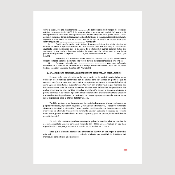 Informe de los defectos constructivos existentes en una obra inacabada así como el análisis de su nivel de ejecución para presupuestar en .xls, se trata de una vivienda unifamiliar con piscina . Se detectan defectos constructivos ubicados en más de 20 zonas de la vivienda: ventanas, repisas, marquesinas, hormigón impreso, electricidad,... y se realiza un análisis de costes para establecer lo que se ha abonado y lo que falta por ejecutar.