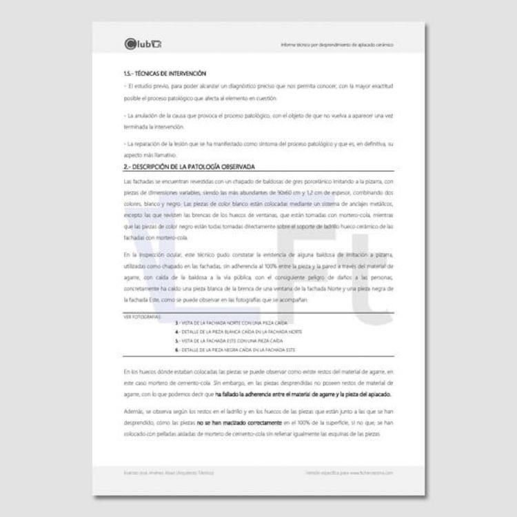Informe técnico en formato plantilla y redactado con motivo del desprendimiento de piezas del revestimiento del aplacado cerámico de la fachada de un edificio residencial de reciente ejecución, debido a problemas de adherencia. Establece las causas, medidas correctoras y valoración económica.
