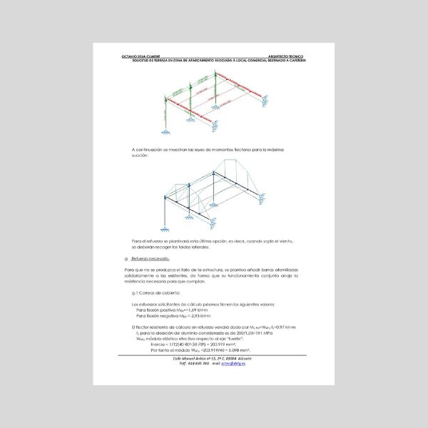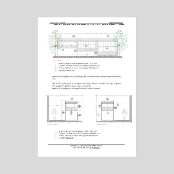 – SOLICITUD EN ZONA DE APARCAMIENTO ASOCIADA A LOCAL DESTINADO A CAFETERIA (Los elementos a colocar en la vía pública para los cuales se pide autorización son especialmente una plataforma para igualar el desnivel existente de la calzada con la acera, vallado de madera de color blanco según ordenanza y un toldo cerramiento formado por perfilería de aluminio y lona de PVC. Incluye cálculo de la estructura)