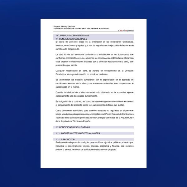 Esta plantilla descargable está pensada para editar y personalizar con los datos de tu propia memoria para instalar una plataforma elevadora como una solución profesional lista para mejorar la accesibilidad a la entrada al edificio. Se basa en un caso real ejecutado en Madrid, que se ajusta a lo realmente exigido por la administración para conceder licencia. Es perfecto para arquitectos, técnicos e instaladores que necesitan avanzar rápido sin comprometer la calidad del proyecto.