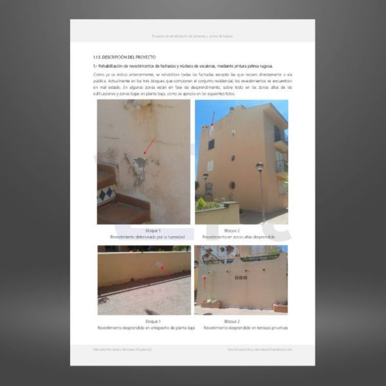Plantilla técnica de ejemplo que puedes descargar, editar y personalizar con los datos de tu proyecto para la reparación de humedades en fachada exterior con cantos de forjado en balcones y escaleras de una gran urbanización de viviendas pareadas distribuidas en 3 bloques. La descarga del documento contempla la memoria completa, los planos en dwg, presupuesto, pliego, estudio básico de seguridad y salud y estudio de gestión de residuos, todo en editable para ayudarte en una gran parte de tu proyecto.